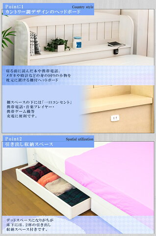 特徴 枕元には1口コンセント、ベッド下には2杯の大型 引き出しを備えた、カントリー調ヘッドボードが かわいらしい棚付きベッドです。