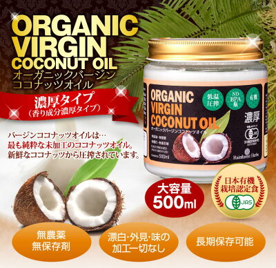 有機JAS 濃厚ココナッツオイル 500ml 1個 エキストラバージン フィリピン産 オーガニック 冷温圧搾一番搾り コールドプレス 無添加 無精製