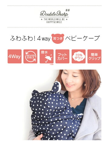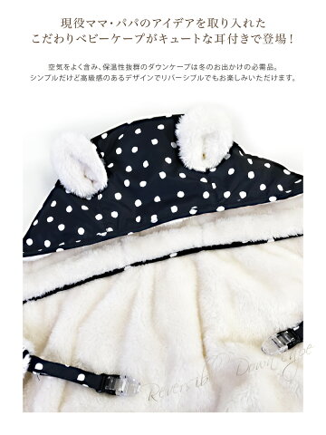 ・ダウン70%配合で軽くてあたたか ・フットカバーで赤ちゃんの足まですっぽり ・ワンタッチの簡単装着クリップ ・かわいいクマ耳付きフード ・両面カンガルーポケット ・4WAY(抱っこ、おんぶ、おくるみ、ベビーカー) 素材 表地:ポリエステル100% 裏地:ポリエステル100% 詰物:ダウン70%/フェザー30% 重さ 580g 洗濯 40度以下のぬるま湯で手洗い、陰干し ご使用上の注意 ・おんぶ、だっこの際はケープの下に必ず子守帯をご着用ください。