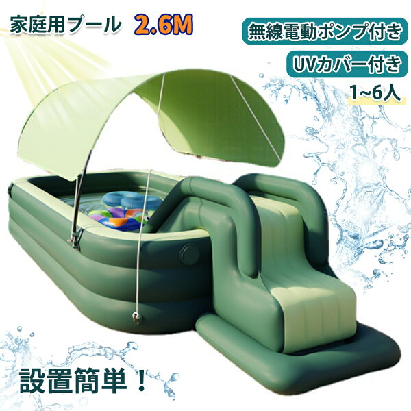 カラー:グリーン、イエロー UVカット:約260*165*130CM 材質:PVC 【セットの内容】 プール本体×1 電動ポンプ×1 日よけカバー×1 カバー用骨組×2 特徴 お子様の充実した夏休みに欠かせないアイテム!毎年大人気のファミリープールです。