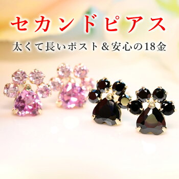 【あす楽対応】セカンドピアス レディース 18K 軸太・パウネル ブラックキュービックジルコニア シンセティックピンクサファイア 18金 ゴールド スタッド ポストが太い 長い ノンアレルギー 可愛いピアス ネコ ねこ 猫 犬 肉球 足跡 誕生日プレゼント 女性 自分へのご褒美
