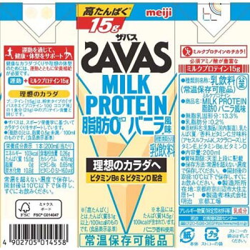 (食品表示基準)【品名・名称】乳飲料【明治 ザバス ミルクプロテイン MILK PROTEIN 脂肪0 バニラ風味の原材料】乳製品(国内製造)、乳たんぱく質/香料、ビタミンC、甘味料(アセスルファムK、スクラロース)、ビタミンE、ビタミンB6、ビタミンD【栄養成分】1本(200ml)当たりエネルギー:103kcal、たんぱく質:15.0g、脂質:0g、炭水化物:10.8g、食塩相当量:0.26g、カルシウム:476mg、ビタミンB6:0.65mg、ビタミンD:5.1-16.0μg【アレルギー物質】乳成分【保存方法】・常温を超えない温度で保存してください。